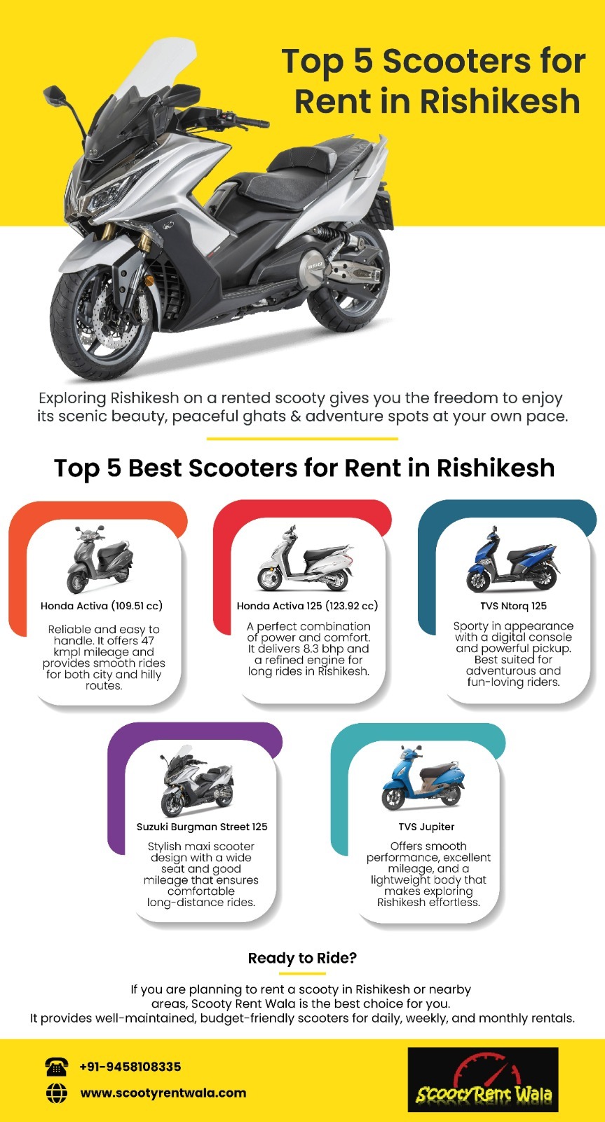 Looking for a scooty on rent in Rishikesh at a discount price? Scooty Rent Wala offers well-maintained scooters and bikes for every type of traveler. Affordable rates, smooth ride quality, and quick booking are available for local sightseeing, café hopping, religious spots, and hill route trips.